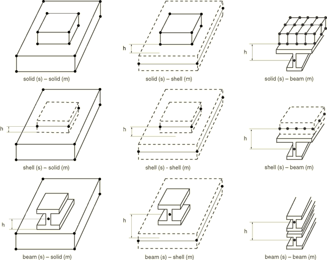 ![]() Adjustments are made only for slave nodes that are included in the user-specified tied node set or that meet the tolerance criteria described above. Adjustments for overlapping constraintsNodal adjustments for tie constraints are processed sequentially in the order of the constraint definitions at the start of an analysis. If different constraint or contact definitions involve the same nodes, some adjustments may cause lack of compliance for contact or constraint definitions that were previously processed. These conflicts are less likely to occur in Abaqus/Explicit because the adjustments in Abaqus/Explicit are automatically processed in the chaining order discussed in Overlapping constraints. These conflicts can be avoided in Abaqus/Standard in some cases by changing the processing order of constraint and contact definitions: nodes in common between different contact or constraint definitions should be processed first as slave nodes and later as master nodes. Input File Usage To change the processing order of constraint and contact definitions, change the order of the definitions in the input file. Constraint and contact definitions are processed in the order in which they appear. Abaqus/CAE Usage To change the processing order of constraint and contact definitions, change the names of the constraints and interactions in the model. Constraints and interactions are processed alphabetically according to their name. Accounting for an offset between tied surfacesAbaqus allows a gap to exist between tied surfaces. Such gaps may exist if you prevent nodal adjustments for tied surfaces. A gap between the reference surfaces may remain due to the presence of shell thickness even if nodal adjustments are performed. Figure 7 shows some cases where an offset between the reference surfaces may be desirable for tied surface pairs to account for shell or beam thickness. Figure 7. Tie constraints being applied between surfaces based on various