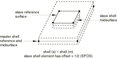 For an element-based master surface a slave node will be moved toward the closest point on the master surface; for a node-based master surface a slave node will be moved toward the closest master node. The corrected position of an adjusted slave node is determined from the combined effects of shell element thickness and any specified reference surface offset relative to the shell midsurface of either slave or master surfaces. Figure 6 shows the adjusted slave node position in an example with two shell element-based surfaces tied together (in this example one of the element reference surfaces is offset from the element midsurface). It is assumed that the surfaces were farther apart than shown in Figure 6 prior to the adjustment; otherwise, the slave nodes would not have been adjusted. Figure 6. Adjusted slave node position for two shell element-based surfaces tied