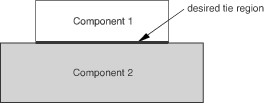The surface-to-surface formulation generally avoids stress noise at tied interfaces. As indicated in Table 1 and Table 2, only a few surface restrictions apply to the surface-to-surface formulation: this formulation reverts to the node-to-surface formulation if a node-based or edge-based surface is used. The surface-to-surface formulation does not allow for a mixture of rigid and deformable portions of a surface, and the master surface must not contain T-intersections. Any nodes shared between the slave and master surfaces will not be tied with the surface-to-surface formulation. The same comments apply to both Abaqus/Standard and Abaqus/Explicit in these tables for the surface-to-surface formulation. With the more traditional node-to-surface formulation additional surface restrictions apply in Abaqus/Standard but fewer restrictions apply in Abaqus/Explicit in comparison to the surface-to-surface formulation. Relatively stringent restrictions on master surface connectivity for the node-to-surface tie formulation in Abaqus/Standard are indicated in Table 2: the master surface must be simply connected and must not contain complex intersections such as T-intersections (see About contact pairs in Abaqus/Standard for examples of surfaces with various connectivity characteristics). Differences with the node-to-surface formulation in Abaqus/Explicit are apparent in Table 1: partially rigid surfaces can be used and the treatment of shared portions of slave and master surfaces is unique to this case. Nodes and faces that are shared between the master and slave surfaces are eliminated automatically from the master surface in this case if the paired surfaces are either both element-based or both node-based, enabling the possibility of tying multiple slave surfaces (defined over various regions of the model) to a common master surface defined over the entire model. This is a convenient way to define tie constraints in large models, as it eliminates the need for defining specialized master surfaces for each surface pairing; however, you must still take care that slave surfaces do not include portions of the opposing surface to which they should be tied (for example, no tie constraints will be generated if the master and slave surfaces are identical). In the node-to-surface formulation in Abaqus/Explicit all facets attached to nodes that are common between slave and master surfaces are excluded from being tied to slave nodes. Sometimes when meshes are transitioned from one type of element to another type or from one element size to another element size, common nodes may exist at the interface of the two regions. Typically, a tie constraint is defined at the interface of the two zones to stitch the two meshes together. In a situation like this common nodes may get tied to a neighboring facet on the interface and may cause undesirable mesh distortion due to the tie adjustment. One possible way to avoid the undesirable mesh distortion is to specify a very small position tolerance for the tie pair. Another situation that may arise when common nodes occur between the slave and master surfaces at the interface of mesh transition zones is that slave nodes in the vicinity of the common node may not get tied. This happens due to the exclusion of master facets attached to the common nodes. Therefore, care must be taken to ensure that elements in different mesh zones do not share common nodes at the interface. For all such common nodes, duplicate nodes occupying the same physical location should be defined. Input File Usage Use the SURFACE option to define the slave and master surfaces used in the constraint (see About surfaces): SURFACE, NAME=slave_surface_name SURFACE, NAME=master_surface_name Abaqus/CAE Usage In Abaqus/CAE you can select one or more faces directly in the viewport when you are prompted to select a surface. In addition, you can define surfaces as collections of faces and edges using the Surface toolset. Specifying the subset of slave nodes to be constrainedBy default, Abaqus uses a position tolerance criterion to determine the constrained nodes based on the distance between the slave nodes and the master surface. Alternatively, you can specify a node set containing the slave nodes to be constrained regardless of their distance to the master surface. Using the position tolerance criterionThe default position tolerance criterion ensures that nodes are tied only where the slave and master surfaces are close to one another in the initial configuration. For example, consider the case shown in Figure 1. Surfaces Comp1_surf and Comp2_surf are defined to cover all exposed faces of Component 1 and Component 2, respectively. These two surfaces can be used as the slave and master surfaces in a tie constraint to tie the two components in the desired region, because only the nodes at the initial interface between the two surfaces are tied. Figure 1. Example of two components to be tied together.