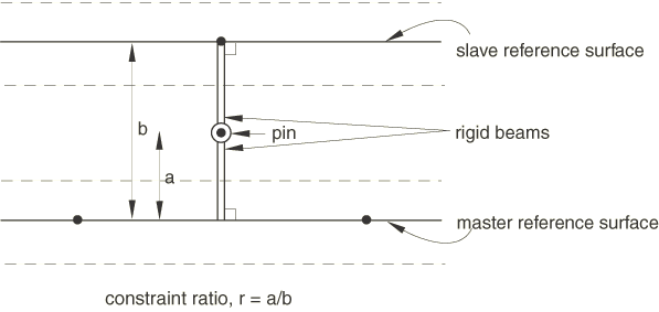 To override these default locations, you can specify a constraint ratio for the tie constraint equal to the fractional distance between the master reference surface and the slave node at which the translational constraint should act. Figure 8 shows an example of the use of a constraint ratio to prescribe the location of the translational constraint between two shell surfaces that are tied together with no rotational constraints. The distance between the master reference surface and the slave reference surface is b. The prescribed constraint ratio, r, is then used to locate the translational constraint at a distance a from the master reference surface. All distances are measured along the vector between the slave node and its projection point onto the master reference surface. The constraint behavior is then similar to that of two rigid beams pinned together, as shown. Input File Usage TIE, CONSTRAINT RATIO=value Abaqus/CAE Usage Interaction module: Create Constraint: Tie: Constraint ratio Figure 8. Use of a constraint ratio to prescribe the location of the
