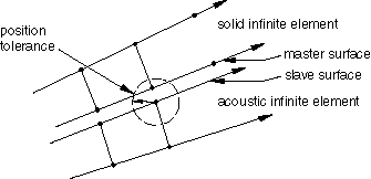 ![]() Constraining a surface to a three-dimensional beamThe master surface for a tie constraint can be based on three-dimensional beam elements. For this case each slave node is projected onto the line formed by the nodes of the beam elements in the undeformed configuration to find the projection point. During the subsequent analysis the motion of each slave node is rigidly constrained to the motion (translation and rotation) of its projection point; i.e., each slave node and its projection point are connected by a rigid beam. Constraining other elements to a beam element-based master surface allows modeling of interactions between the surface of a (complex) beam section and its surroundings, without having to model the beam with continuum and/or shell elements. This feature can be particularly useful for modeling acoustic-structural interactions. Use of tie constraints in non-mechanical simulationsThe surface-based tie constraint capability can be used in models where the nodal degrees of freedom on both the slave and master surfaces include electrical potential, pore pressure, acoustic pressure, and/or temperature. Except for the type of nodal degree of freedom being constrained, Abaqus uses exactly the same formulation for the tie constraint in nonmechanical simulations as it does for mechanical simulations. In general, degrees of freedom common to both surfaces are tied, and any other degrees of freedom are unconstrained. The case of structural-acoustic constraints is the exception to this rule. Here, appropriate relations between the acoustic pressure on the fluid surface and displacements on the solid surface are formed internally (see Acoustic, shock, and coupled acoustic-structural analysis). The displacements and/or pressure degrees of freedom on the surfaces are the only ones affected; rotations are ignored by the tie constraint in this case. The internally computed structural-acoustic coupling conditions use surface areas and normal directions associated with the slave surface elements. The slave surface for structural-acoustic tie constraints cannot be a node-based surface. In two-dimensional analyses the out-of-plane thickness of the slave elements is required. Generally, this thickness is the thickness specified on the section definition for the slave surface elements. However, when beam elements form the slave surface in a tie constraint pair with acoustic elements, a unit thickness in the out-of-plane direction is assumed for the beams. In Abaqus/Standard you can define coupling between solid medium and acoustic medium infinite elements along the surfaces that extend to infinity. These surfaces are defined using the edges of the acoustic elements and sides numbered “2” and higher of the solid medium infinite elements. The infinite surfaces of solid medium and acoustic infinite elements can be coupled only through the use of a surface-based tie constraint. As shown in Figure 9, the acoustic infinite elements must be the slave elements and the edges of the acoustic infinite elements should lie within the specified position tolerance to the solid medium infinite element base facets. Figure 9. Use of a surface-based tie constraint to prescribe the coupling