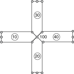 ![]() The normal flow is defined as and where and are the flow rates into the top and bottom surfaces, respectively; and are the fluid leak-off coefficients at the top and bottom element surfaces, respectively; is the midface pressure; and and are the pore pressures on the top and bottom surfaces, respectively. Input File Usage Abaqus/CAE Usage Property module: material editor: Coefficients: Type: Defining leak-off coefficients as a function of temperature and field variablesYou can optionally define leak-off coefficients as functions of temperature and field variables. Input File Usage FLUID LEAKOFF, DEPENDENCIES Abaqus/CAE Usage Property module: material editor: Coefficients: Toggle on Use temperature-dependent data and select the number of field variables.: Type: Defining leak-off coefficients in a user subroutineUser subroutine UFLUIDLEAKOFF can also be used to define more complex leak-off behavior, including the ability to define a time accumulated resistance, or fouling, through the use of solution-dependent state variables. Input File Usage FLUID LEAKOFF, USER Abaqus/CAE Usage Property module: material editor: User: Type: Flow flux induced by gravityIn the presence of a distributed gravity load the tangential flow rate density vector is given by the expression where is the tangential permeability as defined above, is the projection of the gravity vector onto the midsurface of the cohesive element, and is the pore fluid density. For Darcy flow, For Poiseuille flow, in the case of a Newtonian fluid, In the case of a power law fluid, Input File Usage Use the following option to specify the density of the pore fluid: DENSITY, PORE FLUID Abaqus/CAE Usage Property module: material editor: Transition from Darcy flow to Poiseuille flowFor a Newtonian fluid the transition from Darcy flow to Poiseuille flow as a function of the damage variable, , is described by the expression The above relationship also supports a transition from Poiseuille flow back to Darcy flow as the physical gap, , in a damaged element closes. The flow transition equation for a power law fluid is obtained similarly. Initially open elementsYou can define an initial gap to identify elements that are fully damaged; that is, at the integration points of the elements. Input File Usage Use the following option to define the initial gap directly: INITIAL CONDITIONS, TYPE=INITIAL GAP element number or element set, omit values for D Abaqus/CAE Usage Initial gap definition is not supported in Abaqus/CAE. Assigning initial damage valuesYou can define an initial gap to identify elements and assign directly to the integration points. If you assign an initial damage variable to any of the integration points but not all of them, a value of is assigned to the integration points to which you did not assign a value. If an element set is used, you must ensure that all elements within the set have the proper uniform order of integration points. Input File Usage Use the following option to assign initial damage values: INITIAL CONDITIONS, TYPE=INITIAL GAP element number or element set, D at each integration point Abaqus/CAE Usage Initial gap definition is not supported in Abaqus/CAE. Additional considerationsYour use of cohesive element fluid properties and your property values can impact your solution in some cases. Unsymmetric matrix storage and solutionThe pore pressure cohesive element matrices are unsymmetric; therefore, unsymmetric matrix storage and solution may be needed to improve convergence (see Matrix storage and solution scheme in Abaqus/Standard). Large coefficient valuesYou must make sure that the tangential permeability or fluid leak-off coefficients are not excessively large. If either coefficient is many orders of magnitude higher than the permeability in the adjacent continuum elements, matrix conditioning problems may occur, leading to solver singularities and unreliable results. Meshing requirement at intersections of cohesive elementsWhen different layers of cohesive pore pressure elements intersect, a common midsurface node must be shared by all elements to support fluid flow continuity. Figure 4 shows a two-dimensional mesh example of intersecting elements. Elements 10, 20, 30, and 40 share the same middle node, 100, at the intersecting point. Figure 4. Meshing example for two-dimensional intersecting cohesive