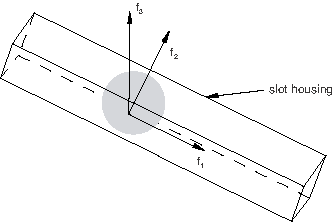 ProductsAbaqus/StandardAbaqus/ExplicitAbaqus/CAE Defining derived components for connector elementsThe definition of coupled behavior in connector elements beyond simple linear elasticity or damping often requires the definition of a resultant force involving several intrinsic (1 through 6) components or the definition of a “direction” not aligned with any of the intrinsic components. These user-defined resultants or directions are called derived components. The forces and motions associated with these derived components are functions of the forces and motions in the intrinsic relative components of motion in the connector element. Consider the case of a SLOT connector for which frictional effects (see Connector friction behavior) are defined in the only available component of relative motion (the 1-direction). The two constraints enforced by this connection type will produce two reaction forces ( and ), as shown in Figure 1. Both forces generate friction in the 1-direction in a coupled fashion. Figure 1. Resultant contact force in a SLOT