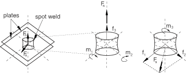 ![]() The connector chosen to model the spot weld has six available components of relative motion: three translations (components 1–3) and three rotations (components 4–6). You have chosen this connection type because you are modeling a general deformation state. However, you would like to define inelastic behavior in the connection in terms of a normal and a shear force, as shown in Figure 5, since experimental data are available in this format. Figure 5. Spot weld connection: derived component definitions.