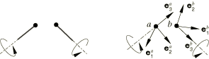 ![]() The shaft direction at node a is , and the shaft direction at node b is . The constant velocity constraint is stated as follows. In any configuration there are two unit length orthogonal vectors and in the plane perpendicular to the shaft at node b. These vectors can be written The angle is chosen such that The constant velocity constraint requires that the angle is constant at all times. The constant velocity constraint is equivalent to constraining the torsion angle to be constant in a FLEXION-TORSION connection. The name “constant velocity” for this connection type derives from the following property. If the angular velocities of the two shafts, and , have components only along each shaft, respectively, and in the direction of the normal to the plane containing the two shafts (that is, along the direction), the components of angular velocity along the respective shaft directions are equal: Hence, the “spinning” angular velocity component is the same about each shaft. The constraint moment imposing the constant velocity constraint has a single component about the average shaft direction and is written Summary