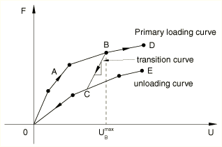 For an overview of the different available behaviors, see Specifying uniaxial behavior for an available component of relative motion above. The various unloading types are discussed in the sections that follow. Defining the onset of permanent deformationBy default, the onset of yield will be obtained as soon as the slope of the loading curve decreases by 10% from the maximum slope recorded up to that point while traversing along the loading curve. To override the default method of determining the onset of yield, you can specify either a value for the decrease in slope of the loading curve other than the default value of 10% (slope drop = 0.1) or by defining the displacement below which unloading occurs along the loading curve. If a slope drop is specified, the onset of yield will be obtained as soon as the slope of the loading curve decreases by the specified factor from the maximum slope recorded up to that point. Input File Usage Use the following options to specify the onset of yield by defining the displacement below which unloading occurs along the loading curve: LOADING DATA, TYPE=PERMANENT DEFORMATION, YIELD ONSET=value Use the following options to specify the onset of yield by defining a slope drop for the loading curve: LOADING DATA, TYPE=PERMANENT DEFORMATION, SLOPE DROP=value Specifying exponential/quadratic unloadingThe model in Figure 7 illustrates an analytical unloading curve that is derived based on an energy dissipation factor, (fraction of energy that is dissipated at any displacement level) and a permanent deformation factor, . As the connector is loaded, the force follows the path given by the loading curve. If the connector is unloaded (for example, at point B), the force follows the unloading curve . The point D corresponds to the permanent deformation, . Reloading after unloading follows the unloading curve until the loading is such that the displacement becomes greater than , after which the loading path follows the loading curve. The arrows shown in Figure 7 illustrate the loading/unloading paths of this model. Figure 7. Exponential/quadratic unloading.