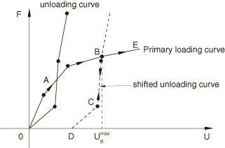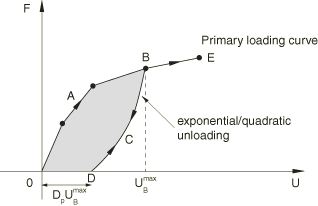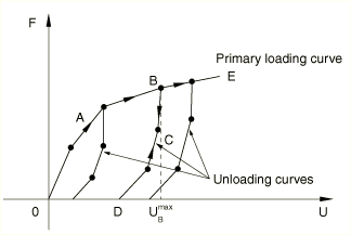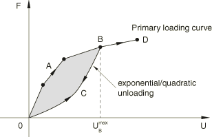 For an overview of the different available behaviors, see Specifying uniaxial behavior for an available component of relative motion above. The various unloading types are discussed in the sections that follow. Defining onset of damageYou can specify the onset of damage by defining the displacement below which unloading occurs along the loading curve. Input File Usage LOADING DATA, TYPE=DAMAGE, DAMAGE ONSET=value Specifying exponential/quadratic unloadingThe damage model in Figure 4 is based on an analytical unloading curve that is derived from an energy dissipation factor, (fraction of energy that is dissipated at any displacement level). As the connector is loaded, the force follows the path given by the loading curve. If the connector is unloaded (for example, at point B), the force follows the unloading curve . Reloading after unloading follows the unloading curve until the loading is such that the displacement becomes greater than , after which the loading path follows the loading curve. The arrows shown in Figure 4 illustrate the loading/unloading paths of this model. Figure 4. Exponential/quadratic unloading.