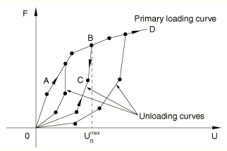 ![]() The unloading response follows the loading curve when the calculated unloading curve lies above the loading curve to prevent energy generation and follows a zero force response when the unloading curve yields a negative response. In such cases the dissipated energy will be less than the value specified by the energy dissipation factor. Input File Usage Use the following option to define quadratic unloading behavior: UNLOADING DATA, DEFINITION=QUADRATIC Use the following option to define exponential unloading behavior: UNLOADING DATA, DEFINITION=EXPONENTIAL Specifying interpolated curve unloadingThe model in Figure 8 illustrates an interpolated unloading response based on multiple unloading curves that intersect the primary loading curve at increasing values of forces/displacements. You can specify as many unloading curves as are necessary to define the unloading response. The first point of each unloading curve defines the permanent deformation if the connector is completely unloaded. The unloading curves are stored in normalized form so that they intersect the loading curve at a unit force for a unit displacement, and the interpolation occurs between these normalized curves. If unloading occurs from a maximum displacement for which an unloading curve is not specified, the unloading curve is interpolated from neighboring unloading curves. As the connector is loaded, the force follows the path given by the loading curve. If the connector is unloaded (for example, at point B), the force follows the unloading curve . Reloading after unloading follows the unloading path until the loading is such that the displacement becomes greater than , after which the loading path follows the loading curve. Figure 8. Interpolated curve unloading.