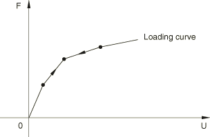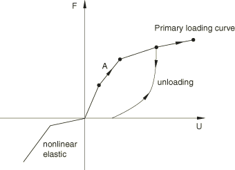 Input File Usage Use the following options to define connector uniaxial behavior: CONNECTOR BEHAVIOR, NAME=name CONNECTOR UNIAXIAL BEHAVIOR, COMPONENT=component number LOADING DATA, DIRECTION=deformation direction, TYPE=behavior type data lines to define loading data UNLOADING DATA data lines to define unloading data Defining the deformation directionThe loading/unloading data can be defined separately for tension and compression by specifying the deformation direction. If the deformation direction is defined (tension or compression), the tabular values defining tensile or compressive behavior should be specified with positive values of forces/moments and displacements/rotations in the specified component of relative motion and the loading data must start at the origin. If the behavior is not defined in a loading direction, the force response will be zero in that direction (the connector has no resistance in that direction). If the deformation direction is not defined, the data apply to both tension and compression. However, the behavior is then considered to be nonlinear elastic and no damage or permanent deformation can be specified. The response data will be considered to be symmetric about the origin if either tensile or compressive data are omitted. Input File Usage Use the following option to define tensile behavior: LOADING DATA, DIRECTION=TENSION Use the following option to define compressive behavior: LOADING DATA, DIRECTION=COMPRESSION Use the following option to define both tensile compressive behavior in a single table: LOADING DATA Behavior that depends on relative positions or motions in multiple component directionsBy default, the loading and unloading functions depend only on the displacement or rotation in the direction of the component of relative motion specified for the connector uniaxial behavior definition (see Connector behavior for details). However, it is also possible to define loading and unloading functions that depend on the constitutive displacements and rotations in multiple component directions. Input File Usage Use the following option to define connector uniaxial behavior that depends on the relative displacements and/or rotations in several component directions: LOADING DATA, INDEPENDENT COMPONENTS=CONSTITUTIVE MOTION Defining rate-independent nonlinear elastic behaviorWhen the loading response is rate independent, the unloading response is also rate independent and occurs along the same user-specified loading curve as illustrated in Figure 1. An unloading curve does not need to be specified. Figure 1. Nonlinear elastic loading.