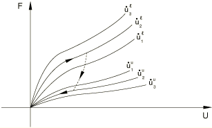 ![]() If the loading curve depends on the constitutive displacements/rotations in several component directions, the unloading curves also depend on the same component directions. The unloading curves also have the same temperature and field variable dependencies as the loading curve. Input File Usage UNLOADING DATA, DEFINITION=INTERPOLATED CURVE Specifying combined unloadingAs illustrated in Figure 6, you can specify an unloading curve in addition to the loading curve as well as a constant transition slope that connects the loading curve to the unloading curve. As the connector is loaded, the force follows the path given by the loading curve. If the connector is unloaded (for example, at point B), the force follows the unloading curve . The path is defined by the constant transition slope, and lies on the specified unloading curve. Reloading after unloading follows the unloading path until the loading is such that the displacement becomes greater than , after which the loading path follows the loading curve. Figure 6. Combined unloading.