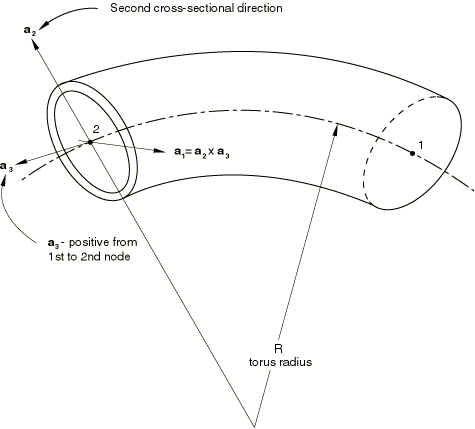 ProductsAbaqus/Standard Typical ApplicationsIn the usual approach to linear analysis of elbows, the response prediction is based on semianalytical results, used as “flexibility factors” to correct results obtained with simple beam theory. Such factors do not apply in nonlinear cases, and the pipeline must be modeled as a shell to predict the response accurately (for example, see Parametric study of a linear elastic pipeline under in-plane bending). Although the elbow elements appear as beams, they are, in fact, shells, with quite complex deformation patterns allowed. In thin-walled elbows the interaction of elbows and adjacent straight segments is an important aspect of elbow modeling, as are the large rotations that readily occur in the cross-sectional deformation, even at small relative rotations of the pipe axis itself. All of these effects (including the stiffening effect of internal pressure) can be modeled with these elements. Elbow elements are intended to provide accurate modeling of the nonlinear response of initially circular pipes and pipebends when distortion of the cross-section by ovalization and warping dominates the behavior. Such behavior arises in two circumstances: in pipebends, where the initial curvature of the pipe, together with the thinness of the wall of the pipe, causes ovalization to dominate the response, and in straight pipe sections, where excessive bending can lead to a buckling collapse of the thin-walled circular section (“Brazier buckling”). Because the elbow elements use a full shell formulation around the circumference, the number of degrees of freedom per element is high. Elbow elements that use all Fourier modes (discussed below) to model ovalization and warping are considerably more expensive computationally than beam elements, but their cost is comparable to that of coarse shell models, which can be used to model the section. If an analysis requires connecting pipe elements to a pipebend, it is easier to connect elbow elements to pipe elements than it is to connect shell elements to pipe elements. Choosing an appropriate elementElbow elements use polynomial interpolation along their length (linear or quadratic depending on the element type), together with Fourier interpolation around the pipe to model the ovalization and warping of the section. Shell theory is then used to model the behavior. Two types of elbow elements are provided. ELBOW31 and ELBOW32Element types ELBOW31 and ELBOW32 are the most complete elbow elements. In these elements the ovalization of the pipe wall is made continuous from one element to the next, thus modeling such effects as the interaction between pipe bends (elbows) and adjacent straight segments of the pipeline. ELBOW31 and ELBOW32 should not be used for the analysis of unconnected straight pipes unless the warping and ovalization are restrained at some point in the pipe. ELBOW31B and ELBOW31CElement types ELBOW31B and ELBOW31C use a simplified version of the formulation, in which ovalization only is considered (no warping) and axial gradients of the ovalization are neglected. These approximations are often satisfactory, and indeed they form the basis of the standard flexibility factor approach used in linear analysis of piping systems. They provide a considerably less expensive capability. ELBOW31C includes the further approximation that the odd numbered terms in the Fourier interpolation around the pipe, except the first term, are neglected. This formulation provides a slightly less expensive model for cases where the radius of the pipe is small compared to the radius of curvature of the pipe axis. Defining the elements section propertiesYou use a beam section definition integrated during the analysis to define the section properties of elbow elements. Give the outside radius of the pipe, r; pipe wall thickness, t; and elbow torus radius, measured to the pipe axis, R. For a straight pipe, set R to zero. You must associate these properties with a set of elbow elements. Input File Usage BEAM SECTION, SECTION=ELBOW, ELSET=name r, t, R Defining the section orientationFor all elbow elements the section must be oriented in space by specifying a point that, together with the nodes of the element, defines the plane of the -axis in Figure 1. For bent pipes this point should lie outside the bend (the side of the pipe on the outside of the bend is referred to as the extrados). For pipebends of less than 180° this point can be set to be the point of intersection of the tangents to the adjacent straight pipe runs. If a pipebend subtends an angle greater than or equal to 180°, the bend should be partitioned into sections of less than 180° and a separate beam section should be defined for each partition so that the point used to define the plane of the -axis can lie outside of the extrados. When the elements are used to model straight pipes, the point can be any point off the pipe axis. Figure 1. Elbow element geometry.