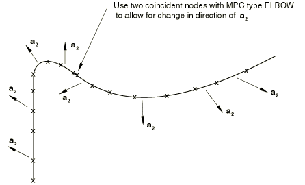 ![]() When ovalization modeling is extended onto straight runs adjacent to a pipebend by using ELBOW31 or ELBOW32 elements for the pipebend and for the straight pipe, you must ensure that the -axis is defined so that its orientation about the axis of the pipe is the same between the pipebend and each of the straight segments. When possible, the -axis should also be the same between adjacent pipebends. In some cases, such as adjacent pipebends in different planes, the -axes are necessarily discontinuous. In such cases separate nodes must be introduced at the point where the -axis changes orientation, and MPC type ELBOW must be invoked to impose the appropriate constraints to ensure continuity of displacements. See Figure 2. Figure 2. Use of MPC type ELBOW with ELBOW31 or ELBOW32.