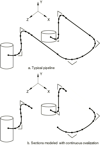 Input File Usage BEAM SECTION, SECTION=ELBOW, TEMPERATURE=VALUES By defining the value at the middle of the pipe wall and the gradient through the thicknessAlternatively, you can define temperatures and field variables by giving the value on the middle surface of the pipe wall and the gradient of temperature with respect to position through the pipe wall thickness, positive when the outside surface is hotter than the inside surface. Input File Usage BEAM SECTION, SECTION=ELBOW, TEMPERATURE=GRADIENTS Using elbow elements in large-displacement analysisWhen elbow elements are subjected to pipe pressure loads (load types PI, PE, HPI, or HPE) in large-displacement analysis (General and perturbation procedures), the most significant contributions to the load stiffness are taken into account. Defining kinematic boundary conditions on elbow elementsKinematic boundary conditions on the standard degrees of freedom at the nodes of elbow elements (that is, degrees of freedom 1–6) should be treated in the usual way. In addition, the elements have ovalization and warping terms stored internally. For ELBOW31B and ELBOW31C elements this requires no additional consideration. For ELBOW31 or ELBOW32 elements you may often need to provide kinematic boundary conditions on these additional degrees of freedom. For example, it is common to model a pipeline with ovalization and warping allowed in the elbows and adjacent straight pipe segments but no ovalization in the middle segments of long, straight pipe runs (see Figure 3). Figure 3. Pipeline schematic.