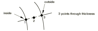 ![]() Input File Usage BEAM SECTION, SECTION=ELBOW first data line coordinates of orientation point Defining the number of integration points and Fourier modesYou can specify the number of integration points and Fourier modes for an elbow section. Experience suggests that for relatively thick-walled cases 4 Fourier modes with 12 integration points around the pipe are sufficient. For thin-walled elbows 6 Fourier modes and 18 integration points around the pipe are needed. As a general rule, the number of integration points around the pipe should not be less than three times the number of Fourier modes used; otherwise, singularities may arise in the stiffness matrix. When used with zero Fourier modes, the elements become simple pipe elements with hoop strain and stress included: when Poisson's ratio is set to zero, they show similar behavior to the PIPE elements in Abaqus (see Choosing a beam element). Input File Usage BEAM SECTION, SECTION=ELBOW first data line second data line number of int. pts. through thickness, number of int. pts. around pipe, number of Fourier modes Assigning a material definition to a set of elbow elementsYou must associate a material definition with each elbow section definition. Input File Usage BEAM SECTION, SECTION=ELBOW, MATERIAL=name Specifying temperature and field variablesTemperature and field variables can be specified by defining the values at specific points through the section or by defining the value at the middle of the pipe wall and specifying the gradient through the pipe thickness. By defining the values at points through the sectionYou can define temperatures and field variables by giving the values at each of the three points shown below.
