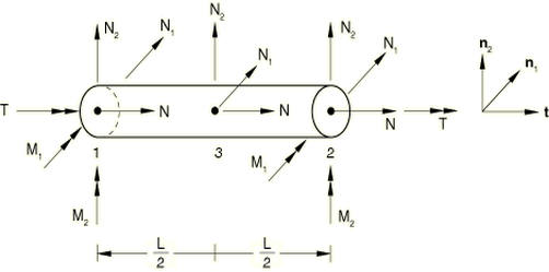 The -direction is then the normal to the element's axis that lies in the plane defined by the element's axis and this approximate -direction. The -direction is defined as . Large-displacement assumptionsThe frame element's formulation includes the effect of large rigid body motions (displacements and rotations) when geometrically nonlinear analysis is selected (see General and perturbation procedures). Strains in these elements are assumed to remain small. Material response (section properties) of frame elementsFor frame elements the geometric and material properties are specified together as part of the frame section definition. No separate material definition is required. You can choose one of the section shapes that is valid for frame elements from the beam cross-section library (see Beam cross-section library). The valid section shapes depend upon whether elastic or elastic-plastic material response is specified or whether buckling strut response is included. See Frame section behavior for a complete discussion of specifying the geometric and material section properties. Input File Usage FRAME SECTION, SECTION=section_type Mechanical response and mass formulationThe mechanical response of a frame element includes elastic and plastic behavior. Optionally, uniaxial buckling strut response is available. Elastic responseThe elastic response of a frame element is governed by Euler-Bernoulli beam theory. The displacement interpolations for the deflections transverse to the frame element's axis (the local 1- and 2-directions in three dimensions; the local 2-direction in two dimensions) are fourth-order polynomials, allowing quadratic variation of the curvature along the element's axis. Thus, each single frame element exactly models the static, elastic solution to force and moment loading at its ends and constant distributed loading along its axis (such as gravity loading). The displacement interpolation along an element's axis is a second-order polynomial, allowing linear variation of the axial strain. In three dimensions the twist rotation interpolation along an element's axis is linear, allowing constant twist strain. The elastic stiffness matrix is integrated numerically and used to calculate 15 nodal forces and moments in three dimensions: an axial force, two shear forces, two bending moments, and a twist moment at each end node, and an axial force and two shear forces at the midpoint node. In two dimensions 8 nodal forces and moments exist: an axial force, a shear force, and a moment at each end, and an axial force and a shear force at the midpoint. The forces and moments are illustrated in Figure 1. Figure 1. Forces and moments on a frame element in space.