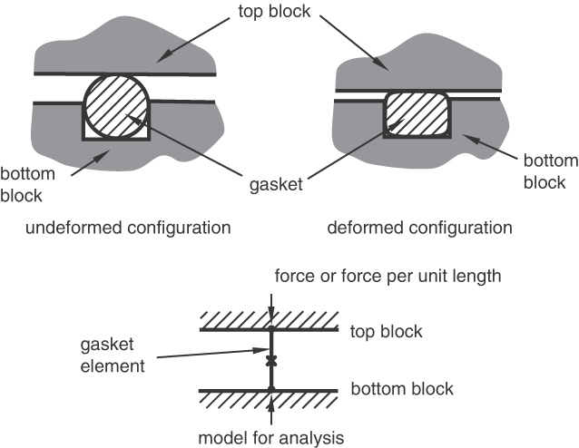 ProductsAbaqus/StandardAbaqus/CAE Assigning a gasket behavior to a gasket elementTo define the gasket behavior by a gasket behavior model, you must assign a gasket section definition to a region of your model and assign the name of a gasket behavior definition to the gasket section definition. The gasket behavior for this region is defined entirely by the properties specified by the gasket behavior definition referring to the same name. Input File Usage Use both of the following options to define the gasket behavior in terms of a gasket behavior model: GASKET SECTION, ELSET=name, BEHAVIOR=name GASKET BEHAVIOR, NAME=name Abaqus/CAE Usage Property module: Material editor: Name: name, enter data for any materials found under Create Section: select Other as the section Category and Gasket as the section Type: Material: name Specifying a gasket behaviorThe thickness-direction, transverse shear, and membrane behaviors are defined to be uncoupled. Each behavior is specified independently. You must specify the thickness-direction behavior. You can specify multiple thickness-direction behaviors to define the loading and unloading characteristics. You can obtain an average contact pressure output when the thickness-direction behavior is defined as force or force per unit length versus closure. The transverse shear and membrane behaviors are optional for gasket elements that have all displacement degrees of freedom active at their nodes. You can define one or both of these behaviors. When thermal and rate-dependent effects are important, you can define thermal expansion and creep behavior for gaskets; user subroutines UEXPAN and CREEP can be used to define these behaviors. You cannot specify density for gasket elements since they have no mass matrix. Input File Usage Use the first two options and any of the following options to specify a gasket behavior: GASKET BEHAVIOR, NAME=name GASKET THICKNESS BEHAVIOR GASKET ELASTICITY GASKET CONTACT AREA EXPANSION CREEP DEPVAR USER OUTPUT VARIABLES The GASKET THICKNESS BEHAVIOR option can be repeated to define the loading and unloading characteristics of the thickness-direction behavior. The GASKET ELASTICITY option can be repeated to define both transverse shear and membrane behaviors. The other options cannot be repeated within a single behavior definition. The order in which these options are specified has no importance, but they must appear immediately after the GASKET BEHAVIOR option. Abaqus/CAE Usage Use the first option and any of the following options to specify a gasket behavior: Property module: material editor: Gasket Membrane Elasticityand/or Defining the thickness-direction behavior of the gasketTo define the thickness-direction behavior of gaskets, Abaqus/Standard offers a nonlinear elastic model with damage and a nonlinear elastic-plastic model with the possibility of considering creep effects. Thermal effects in the thickness direction can also be accounted for. Abaqus/Standard measures the thickness-direction deformation as the closure between the bottom and top faces of the gasket element; therefore, the thickness-direction behavior must always be defined in terms of closure. The closure is the sum of the elastic closure, plastic closure, creep closure, thermal closure, plus any initial gap in the thickness direction. As explained below, the behavior can be defined as pressure versus closure, force versus closure, or force per unit length versus closure. In all cases the thickness-direction behavior can be defined as a function of temperature and/or field variables. Input File Usage GASKET THICKNESS BEHAVIOR, DEPENDENCIES Abaqus/CAE Usage Property module: material editor: Choosing a unit system used to define the thickness-direction behaviorThe thickness-direction behavior can be defined in terms of pressure versus closure, force versus closure, or force per unit length versus closure. Prescribing the thickness-direction behavior as pressure versus closureYou can define the thickness-direction behavior in terms of pressure and closure for all gasket element types. The pressure is available for output or visualization. Input File Usage GASKET THICKNESS BEHAVIOR, VARIABLE=STRESS Abaqus/CAE Usage Property module: material editor: Units: Stress: Prescribing the thickness-direction behavior as force or force per unit length versus closureYou can define the thickness-direction behavior in terms of force or force per unit length and closure only for link elements and three-dimensional line elements. This method is suited for cases where the gasket cross-section in the 1–2 or 1–3 plane varies greatly with deformation because it would be too expensive to model such a deformation with a full two- or three-dimensional model. In such cases a model with link elements or three-dimensional line elements can give meaningful answers as long as the deformation is quantified in terms of force or force per unit length (see Figure 1). Figure 1. Modeling complex deformations with link or three-dimensional line