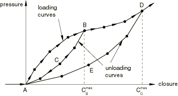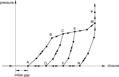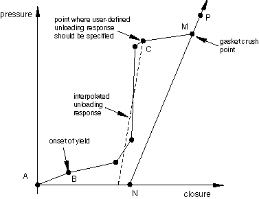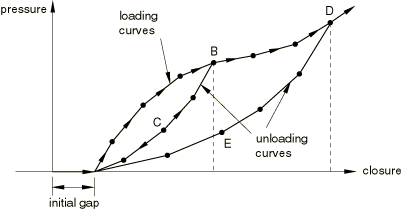 ![]() In this case it is insufficient to specify only one unloading curve at the gasket crush point (the end of the loading data). If unloading were to take place from point C, the unloading path would cross over the loading path. At least one additional unloading curve is required, after the sharp decrease in hardening slope, to prevent the interpolated unloading path crossing the loading curve. Input File Usage GASKET THICKNESS BEHAVIOR, TYPE=ELASTIC-PLASTIC, DIRECTION=UNLOADING Abaqus/CAE Usage Property module: material editor: Type: Elastic-Plastic, Unloading, toggle on Include user-specified unloading curves: Defining the behavior for elements with an initial gapFor cases when the load in the gasket does not increase as soon as the gasket is compressed (see Figure 6), you can specify an initial gap as part of the gasket section property definition (see Defining the gasket element's initial geometry) and define the loading/unloading curves as if the initial gap were not present (the case of Figure 4). This method is convenient when many gasket elements refer to the same gasket behavior and the only difference is the initial gap. Figure 6. Elastic-plastic model with initial gap.