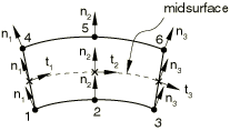 ![]() Two-dimensional and axisymmetric elementsTo compute the thickness direction for two-dimensional and axisymmetric elements, Abaqus/Standard forms a midsurface by averaging the coordinates of the node pairs forming the bottom and top surfaces of the element. This midsurface passes through the integration points of the element, as shown in Figure 2. For each integration point Abaqus/Standard computes a tangent whose direction is defined by the sequence of nodes given on the bottom and top surfaces. The thickness direction is then obtained as the cross product of the out-of-plane and tangent directions. The thickness direction computed at each integration point is then assigned to the nodes on either side of the integration point. Figure 2. Thickness direction for a two-dimensional or axisymmetric