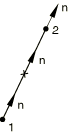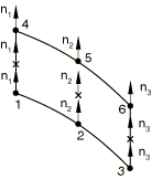![]() Three-dimensional line elementsTo compute the thickness direction for three-dimensional line elements, Abaqus/Standard computes the thickness direction at each integration point of the line element by differencing the coordinates of the element's surface nodes associated with the integration point. The thickness direction will point from the node on the bottom face to the node on the top face of the element. The thickness direction computed at each integration point is then assigned to the nodes on either side of the integration point (see Figure 4). Figure 4. Thickness direction for a three-dimensional line element.