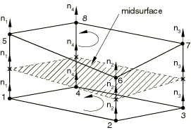 ![]() Three-dimensional area elementsTo compute the thickness direction for three-dimensional area elements, Abaqus/Standard forms a midsurface by averaging the coordinates of the node pairs forming the bottom and top surfaces of the element. This midsurface passes through the integration points of the element, as shown in Figure 3. Abaqus/Standard computes the thickness direction to the midsurface at each integration point; the positive direction is obtained with the right-hand rule going around the nodes of the element on the bottom or top surface. The thickness direction computed at each integration point is assigned to the nodes on either side of the integration point. Figure 3. Thickness direction for a three-dimensional area element.