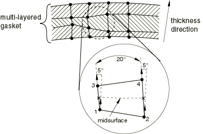 ![]() If the gasket element is very thin, the computation of the thickness direction may not be accurate. You can overwrite this definition as explained below in Specifying the thickness direction explicitly. Creating a smooth gasketGasket elements can be used in a single layer or can be stacked in multiple layers (see Including gasket elements in a model for further details). The thickness directions computed at the nodes of gasket elements on an element-by-element basis are averaged at nodes shared by two or more gasket elements. This averaging process ensures that, if the gasket is not planar, it has a thickness direction that varies smoothly even though the gasket has been discretized by elements. You must ensure that the connectivities of the elements are such that the thickness direction does not reverse from one element to the next for this process to work properly. Once the averaging process is complete, the thickness directions at the nodes of a given element may vary significantly along the gasket midsurface and through its thickness, as shown in Figure 5. The thickness directions at any of the nodes of an element should not vary in direction by more than 20°. In addition, the thickness directions of two associated nodes through the thickness direction should not vary in direction by more than 5°. Abaqus/Standard will require that the gasket be remeshed when such conditions are not met. Figure 5. Result of the averaging process.