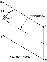 ![]() For three-dimensional line elements, the local 2-direction is obtained by the projection of the tangent to the midsurface of the element onto the plane orthogonal to the local 1-direction (see Figure 5). The local 3-direction is then obtained by the cross product of the local 1- and 2-directions. Figure 5. Local directions for three-dimensional line gasket elements.