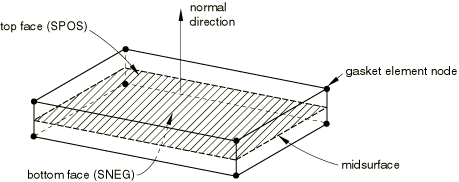 ![]() Gaskets are usually very thin and act as sealing components between structural components. They are carefully designed to provide appropriate pressure-closure behaviors through their thickness (the thin direction of the gaskets) so that they maintain their sealing action as the components undergo deformations due to thermal and mechanical loads. It is difficult to use solid continuum elements to model the through-thickness behavior of gaskets with the material library available. Therefore, Abaqus/Standard offers a variety of gasket elements that have through-thickness behaviors specifically designed for the study of gaskets. The gasket behavior models are separate from the models in the material library and assume that the thickness-direction, transverse shear, and membrane behaviors are uncoupled (see Defining the gasket behavior directly using a gasket behavior model for details). For a gasket behavior that is not readily addressed by these special behavior models, such as occurs when coupled behaviors or through-thickness tensile behavior must be considered, Abaqus/Standard provides a versatile alternative by allowing a gasket element to use either a built-in or user-defined material model (see Defining the gasket behavior using a material model for details). Spatial representation of a gasket elementFigure 2 demonstrates the key geometrical features that are used to define gasket elements. Gasket elements are composed of two surfaces separated by a thickness. The relative motion of the bottom and top surfaces measured along the thickness direction to the gasket quantifies the thickness-direction (local 1-direction) behavior of the gasket element. The relative change in position of the bottom and top surfaces measured in the plane orthogonal to the thickness direction quantifies the transverse shear behavior of the gasket element. The stretching and shearing of the midsurface of the element (the surface halfway between the bottom and top surfaces) quantifies the membrane behavior of the gasket element. Figure 2. Spatial representation of a gasket element.