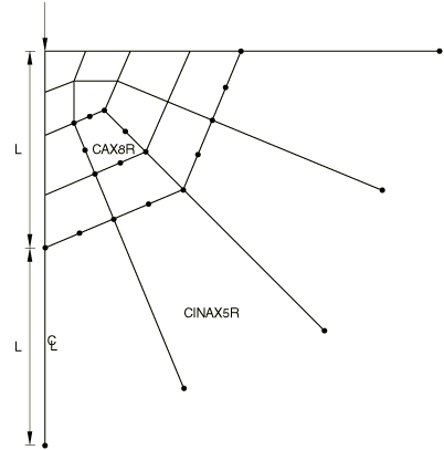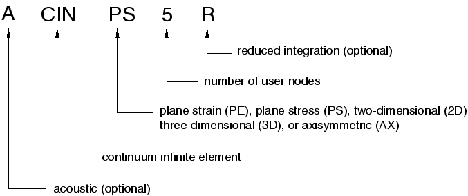 ProductsAbaqus/StandardAbaqus/ExplicitAbaqus/CAE Typical ApplicationsThe analyst is sometimes faced with boundary value problems defined in unbounded domains or problems in which the region of interest is small in size compared to the surrounding medium. Infinite elements are intended to be used for such cases in conjunction with first- and second-order planar, axisymmetric, and three-dimensional finite elements. Standard finite elements should be used to model the region of interest, with the infinite elements modeling the far-field region. Choosing an appropriate elementPlane stress, plane strain, three-dimensional, and axisymmetric infinite elements are available. Reduced-integration elements are also available in Abaqus/Standard. Element type CIN3D18R is intended for use with the three-dimensional variable-number-of-node solids C3D15V, C3D27, and C3D27R in Abaqus/Standard. Acoustic infinite elements are also available in Abaqus. Naming conventionInfinite elements in