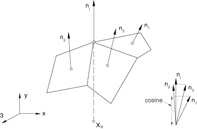 ![]() Each node ray is a unit vector in the direction of the line between the reference point and the node. These radii and rays are used in the formulation of acoustic infinite elements. The placement of the reference point is not extremely critical as long as it is near the center of the finite region enclosed by the infinite elements. If acoustic infinite elements are placed on the surface of a sphere, the optimal location for the reference point is the center of the sphere. Acoustic infinite elements whose section properties are defined using a particular solid section definition should not have any nodes in common with acoustic infinite elements associated with a different solid section definition. This is to ensure a unique reference point (and, therefore, a unique “radius” and “node ray”) for each acoustic infinite element node. The node rays are used to compute “cosine” values at each node of the infinite element interface. The “cosine” is equal to the smallest dot product of the unit node ray and the unit normals of all acoustic infinite element faces surrounding the node (see Figure 2). An error message is issued for negative values of “cosine.” Both the “radius” and “cosine” for all nodes of acoustic infinite elements are printed to the data (.dat) file as nodal (model) data. For details of how these quantities are used in the formulation, see Acoustic infinite elements. Figure 2. Defining the cosine for acoustic infinite elements.