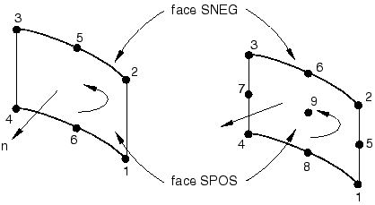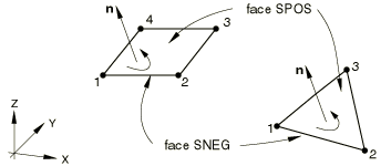 Element normal definitionThe “top” surface of a membrane is the surface in the positive normal direction (defined below) and is called the SPOS face for contact definition. The “bottom” surface is in the negative direction along the normal and is called the SNEG face for contact definition. General membrane elementsFor general membrane elements the positive normal direction is defined by the right-hand rule going around the nodes of the element in the order that they are specified in the element definition. See Figure 1. Figure 1. Positive normals for general membranes.