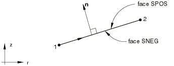 ![]() Axisymmetric membrane elementsFor axisymmetric membrane elements the positive normal is defined by a 90° counterclockwise rotation from the direction going from node 1 to node 2. See Figure 3. Figure 3. Positive normals for axisymmetric membranes.
