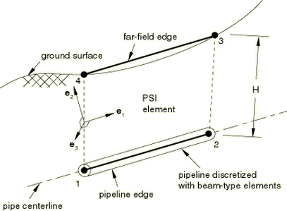 ProductsAbaqus/Standard Pipe foundation elementsAbaqus/Standard provides two-dimensional (PSI24 and PSI26) and three-dimensional (PSI34 and PSI36) pipe-soil interaction elements for modeling the interaction between a buried pipeline and the surrounding soil. The pipeline itself is modeled with any of the beam, pipe, or elbow elements in the Abaqus/Standard element library (see About beam modeling and Pipes and pipebends with deforming cross-sections: elbow elements). The ground behavior and soil-pipe interaction are modeled with the pipe-soil interaction (PSI) elements. These elements have only displacement degrees of freedom at their nodes. One side or edge of the element shares nodes with the underlying beam, pipe, or elbow element that models the pipeline (see Figure 1). The nodes on the other edge represent a far-field surface, such as the ground surface, and are used to prescribe the far-field ground motion via boundary conditions together with amplitude references as needed. Figure 1. Pipe-soil interaction model.