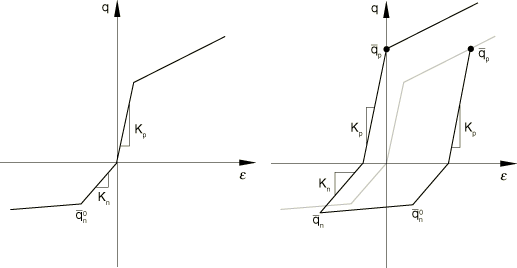 ![]() You must provide the data in ascending order of relative displacement; you should provide it over a sufficiently wide range of relative displacement values so that the behavior is defined correctly. The force remains constant outside the range of data points. You must separate positive and negative data by specifying the data point at the origin of the force-relative displacement diagram. The two data points immediately before and after the data point at the origin define the elastic stiffness, and , and the initial elastic limits, and , as indicated in Figure 3. The model provides linear elastic behavior if where and are the equivalent plastic strains associated with negative and positive deformations, respectively. Inelastic deformation occurs when the relative force exceeds these elastic limits. Hardening of the model is controlled by independent evolution of and . The model assumes that remains constant when the increment in relative displacement is negative, and remains constant when the increment in relative displacement is positive. The response predicted by this model during a full loading cycle is shown in Figure 4 for a simple constitutive law that uses different bilinear behavior associated with positive and negative force. Figure 4 shows that the yield stress associated with positive force is updated to , while the initial yield stress associated with negative force, , remains constant during initial loading. Similarly, during subsequent reversed loading the yield stress associated with negative force is updated to , while the yield stress associated with positive force remains constant. Consequently, yielding occurs at during the next load reversal. Such behavior is appropriate for the directions transverse to the pipeline where it is expected that relative positive motion between the pipe and soil is independent from relative negative motion between the pipe and soil. Figure 4. Cyclic loading for a bilinear model.