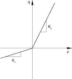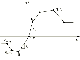 ![]() Input File Usage PIPE-SOIL STIFFNESS, TYPE=LINEAR Nonlinear modelTo define a nonlinear constitutive model, you specify the relationship as a function of positive and negative relative displacement (“strain”), temperature, and field variables (see Figure 3). The behavior is assumed symmetric about the origin if only positive or negative data are provided. Figure 3. Nonlinear constitutive relationship.