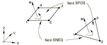 ![]() ConventionsThe conventions that are used for shell elements are defined below. Definition of local directions on the surface of a shell in spaceThe default local directions used on the surface of a shell for definition of anisotropic material properties and for reporting stress and strain components are defined in Conventions. You can define other directions by defining a local orientation (see Orientations), except for SAX1, SAX2, and SAX2T elements (Axisymmetric shell element library), which do not support orientations. A spatially varying local coordinate system defined with a distribution (Distribution definition) can be assigned to shell elements. For SAXA elements (Axisymmetric shell elements with nonlinear, asymmetric deformation) any anisotropic material definition must be symmetric with respect to the r–z plane at and . In large-deformation (geometrically nonlinear) analysis these local directions rotate with the average rotation of the surface at that point. They are output as directions in the current configuration except in the shell elements in Abaqus/Standard that provide only large rotation but small strain (element types STRI3, STRI65, S4R5, S8R, S8RT, S8R5, S9R5—see Choosing a shell element), where they are output as directions in the reference configuration. Therefore, in geometrically nonlinear analysis, when displaying these directions or when displaying principal values of stress, strain, or section forces or moments in Abaqus/CAE, the current (deformed) configuration should be used except for the small-strain elements in Abaqus/Standard, for which the reference configuration should be used. Positive normal definition for conventional shell elementsThe “top” surface of a conventional shell element is the surface in the positive normal direction and is referred to as the positive (SPOS) face for contact definition. The “bottom” surface is in the negative direction along the normal and is referred to as the negative (SNEG) face for contact definition. Positive and negative are also used to designate top and bottom surfaces when specifying offsets of the reference surface from the shell's midsurface. The positive normal direction defines the convention for pressure load application and output of quantities that vary through the thickness of the shell. A positive pressure load applied to a shell element produces a load that acts in the direction of the positive normal. Three-dimensional conventional shellsFor shells in space the positive normal is given by the right-hand rule going around the nodes of the element in the order that they are specified in the element definition. See Figure 2. Figure 2. Positive normals for three-dimensional conventional shells.