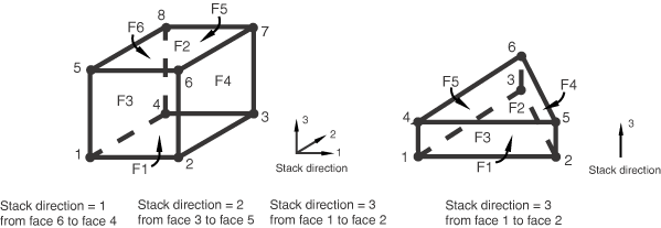 ![]() It is important that the continuum shells are oriented properly, since the behavior in the thickness direction is different from that in the in-plane directions. By default, the element top and bottom faces and, hence, the element normal, stacking direction, and thickness direction are defined by the nodal connectivity. For the triangular in-plane continuum shell element (SC6R) the face with corner nodes 1, 2, and 3 is the bottom face; and the face with corner nodes 4, 5, and 6 is the top face. For the quadrilateral continuum shell element (SC8R) the face with corner nodes 1, 2, 3, and 4 is the bottom face; and the face with corner nodes 5, 6, 7, and 8 is the top face. The stacking direction and thickness direction are both defined to be the direction from the bottom face to the top face. Additional options for defining the element thickness direction, including one option that is independent of nodal connectivity, are presented below. Surfaces on continuum shells can be defined by specifying the face identifiers S1–S6 identifying the individual faces as defined in Continuum shell element library. Free surface generation can also be used. Pressure loads applied to faces P1–P6 are defined similar to continuum elements, with a positive pressure directed into the element. Defining the stacking and thickness directionBy default, the continuum shell stacking direction and thickness direction are defined by the nodal connectivity as illustrated in Figure 4. Alternatively, you can define the element stacking direction and thickness direction by either selecting one of the element's isoparametric directions or by using an orientation definition. Defining the stacking and thickness direction based on the element isoparametric directionYou can define the element stacking direction to be along one of the element's isoparametric directions (see Figure 5 for element stack directions). The 8-node hexahedron continuum shell has three possible stacking directions; the 6-node in-plane triangular continuum shell has only one stack direction, which is in the element 3-isoparametric direction. The default stacking direction is 3, providing the same thickness and stacking direction as outlined in the previous section. To obtain a desired thickness direction, the choice of the isoparametric direction depends on the element connectivity. For a mesh-independent specification, use an orientation-based method as described below. Figure 5. Stack directions for SC6R and SC8R elements.