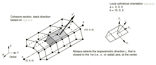 ![]() Input File Usage Use one of the following options to define the element stacking direction based on the element's isoparametric directions: SHELL SECTION, STACK DIRECTION=n SHELL GENERAL SECTION, STACK DIRECTION=n where n = 1, 2, or 3. Abaqus/CAE Usage Use the following option to define the stacking direction based on the element's isoparametric directions if the continuum shell is defined using a composite layup: Property module: Create Composite Layup: select Continuum Shell as the Element Type: Stacking Direction: Element direction 1, Element direction 2, or Element direction 3 Use the following option to define the stacking direction based on the element's isoparametric directions if the continuum shell is defined using a composite shell section: Stacking Direction: Element isoparametric direction 1, Element isoparametric direction 2, or Element isoparametric direction 3: select regions: : Defining the stacking and thickness direction based on an orientation definitionAlternatively, you can define the element stacking direction based on a local orientation definition. For shell elements the orientation definition defines an axis about which the local 1 and 2 material directions may be rotated. This axis also defines an approximate normal direction. The element stacking and thickness directions are defined to be the element isoparametric direction that is closest to this approximate normal (see Figure 6). Figure 6. Example illustrating the use of a cylindrical system to define the