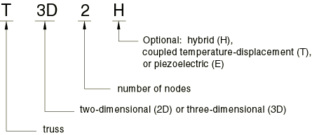 ProductsAbaqus/StandardAbaqus/ExplicitAbaqus/CAE Typical ApplicationsTruss elements are used in two and three dimensions to model slender, line-like structures that support loading only along the axis or the centerline of the element. No moments or forces perpendicular to the centerline are supported. The two-dimensional truss elements can be used in axisymmetric models to represent components, such as bolts or connectors, where the strain is computed from the change in length in the r–z plane only. Two-dimensional trusses can also be used to define master surfaces for contact applications in Abaqus/Standard (see About contact interactions). In this case the direction of the master surface's outward normal is critical for proper detection of contact. The 3-node truss element available in Abaqus/Standard is often useful for modeling curved reinforcing cables in structures, such as prestressed tendons in reinforced concrete or long slender pipelines used in the off-shore industry. Choosing an appropriate elementA 2-node straight truss element, which uses linear interpolation for position and displacement and has a constant stress, is available in both Abaqus/Standard and Abaqus/Explicit. In addition, a 3-node curved truss element, which uses quadratic interpolation for position and displacement so that the strain varies linearly along the element, is available in Abaqus/Standard. Hybrid versions of the stress/displacement trusses, coupled temperature-displacement trusses, and piezoelectric trusses are available in Abaqus/Standard. Hybrid stress/displacement truss elementsHybrid (mixed) versions of the stress/displacement trusses, in which the axial force is treated as an additional unknown, are available in two and three dimensions in Abaqus/Standard. These elements are useful (to offset the effects of numerical ill-conditioning on governing equations) when a truss represents a very rigid link whose stiffness is much larger than that of the overall structural model. In such a case a hybrid truss provides an alternative to a truly rigid link, modeled with multi-point constraints (see General multi-point constraints) or rigid elements (see Rigid elements). Coupled temperature-displacement truss elementsCoupled temperature-displacement truss elements are available in two and three dimensions in Abaqus/Standard. These elements have temperature as an additional degree of freedom (11). See Fully coupled thermal-stress analysis for information about fully coupled temperature-displacement analysis in Abaqus/Standard. Piezoelectric truss elementsPiezoelectric truss elements are available in two and three dimensions in Abaqus/Standard. These elements have electric potential as an additional degree of freedom (9). See Piezoelectric analysis for information about piezoelectric analysis. Naming conventionTruss elements in