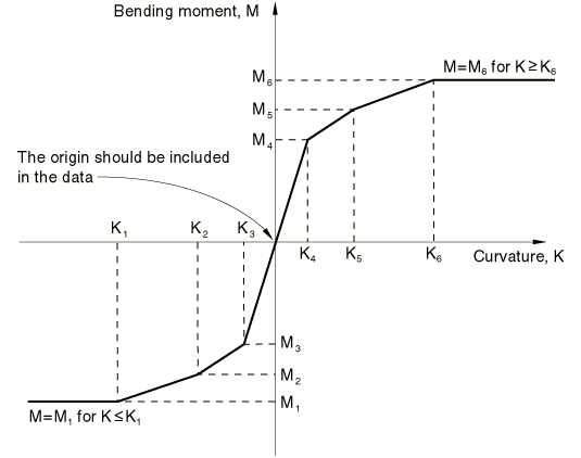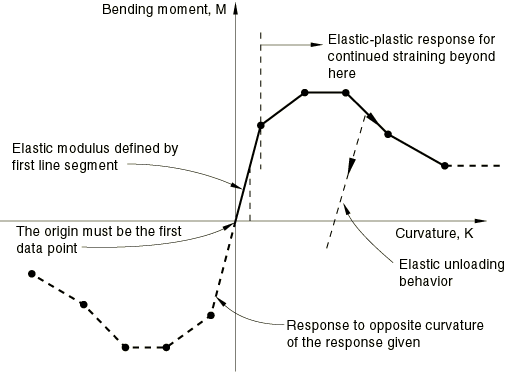 ![]() Defining elastic-plastic response for N, M1, M2, and TBy default, elastic-plastic response is assumed for N, , , and T. The inelastic model is based on assuming linear elasticity and isotropic hardening (or softening) plasticity. The data in this case must begin with the point and proceed to give positive values of the kinematic variable at increasing positive values of the conjugate force or moment. Strain softening is allowed. The elastic modulus is defined by the slope of the initial line segment, so that straining beyond the point that terminates that initial line segment will be partially inelastic. If strain reversal occurs in that part of the response, it will be elastic initially. See Figure 2 for an example. Input File Usage Use the following options to define elastic-plastic axial, bending, and torsional behavior: AXIAL M1 M2 TORQUE Abaqus/CAE Usage Nonlinear generalized cross-sections are not supported in Abaqus/CAE. Figure 2. Example of inelastic nonlinear beam section behavior