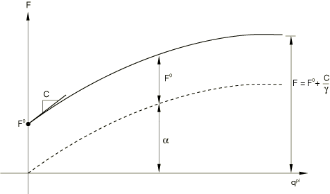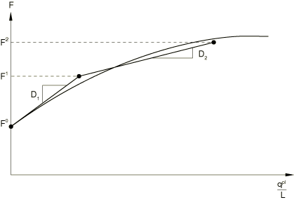 ![]() Allowing Abaqus/Standard to generate the default nonlinear kinematic hardening modelTo define the default plastic response, three data points are generated from the yield stress value and the cross-section shape. These three data points relate generalized force to generalized plastic displacement per unit length of the element. Since the model is calibrated per unit element length, the generated default plastic response is different for different element lengths. The generalized force levels for these three points are , , and . is the generalized force at zero plastic generalized displacement. and are generalized force magnitudes that characterize the ultimate load-carrying capacity. The slopes between the data points (i.e., the generalized plastic moduli and ) characterize the hardening response. See Figure 2 for an illustration of the default nonlinear kinematic hardening model. Figure 2. Data points generated for the default nonlinear kinematic hardening