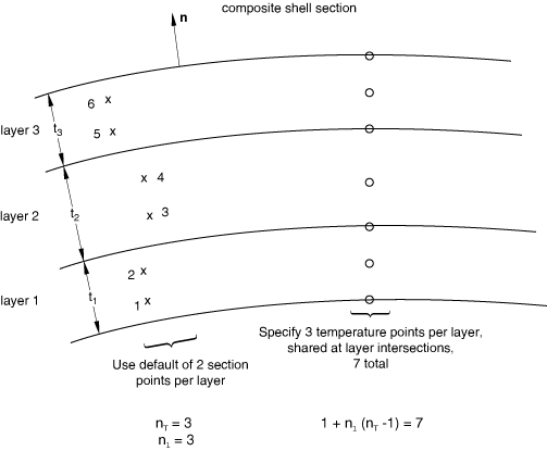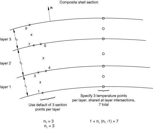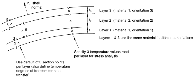 ProductsAbaqus/StandardAbaqus/ExplicitAbaqus/CAE Defining a homogeneous shell sectionTo define a shell made of a single material, use a material definition (Material data definition) to define the material properties of the section and associate these properties with the section definition. Optionally, you can refer to an orientation (Orientations) to be associated with this material definition. A spatially varying local coordinate system defined with a distribution (Distribution definition) can be assigned to the shell section definition. Linear or nonlinear material behavior can be associated with the section definition. However, if the material response is linear, the more economic approach is to use a general shell section (see Using a general shell section to define the section behavior). You specify the shell thickness and the number of integration points to be used through the shell section (see below). For continuum shell elements the specified shell thickness is used to estimate certain section properties, such as hourglass stiffness, which are later computed using the actual thickness computed from the element geometry. You must associate the section properties with a region of your model. If the orientation definition assigned to a shell section definition is defined with distributions, spatially varying local coordinate systems are applied to all shell elements associated with the shell section. A default local coordinate system (as defined by the distributions) is applied to any shell element that is not specifically included in the associated distribution. Input File Usage SHELL SECTION, ELSET=name, MATERIAL=name, ORIENTATION=name where the ELSET parameter refers to a set of shell elements. Abaqus/CAE Usage Property module: Create Section: select Shell as the section Category and Homogeneous as the section Type: Section integration: During analysis; Basic: Material: name : select regions : select regions Defining a composite shell sectionYou can define a laminated (layered) shell made of one or more materials. You specify the thickness, the number of integration points (see below), the material, and the orientation (either as a reference to an orientation definition or as an angle measured relative to the overall orientation definition) for each layer of the shell. The order of the laminated shell layers with respect to the positive direction of the shell normal is defined by the order in which the layers are specified. Optionally, you can specify an overall orientation definition for the layers of a composite shell. A spatially varying local coordinate system defined with a distribution (Distribution definition) can be used to specify the overall orientation definition for the layers of a composite shell. For continuum shell elements the thickness is determined from the element geometry and may vary through the model for a given section definition. Hence, the specified thicknesses are only relative thicknesses for each layer. The actual thickness of a layer is the element thickness times the fraction of the total thickness that is accounted for by each layer. The thickness ratios for the layers need not be given in physical units, nor do the sum of the layer relative thicknesses need to add to one. The specified shell thickness is used to estimate certain section properties, such as hourglass stiffness, which are later computed using the actual thickness computed from the element geometry. Spatially varying thicknesses can be specified on the layers of conventional shell elements using distributions (Distribution definition). A distribution that is used to define layer thickness must have a default value. The default layer thickness is used by any shell element assigned to the shell section that is not specifically assigned a value in the distribution. An example of a section with three layers and three section points per layer is shown in Figure 1. Figure 1. Example of composite shell section definition.