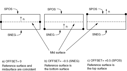 ![]() Input File Usage Use the following option to specify a value for the shell offset: SHELL SECTION, OFFSET=offset The OFFSET parameter accepts a value, a label (SPOS or SNEG), or in an Abaqus/Standard analysis the name of a distribution that is used to define a spatially varying offset. Specifying SPOS is equivalent to specifying a value of 0.5; specifying SNEG is equivalent to specifying a value of −0.5. Abaqus/CAE Usage Use the following option for a composite layup: Property module: composite layup editor: Section integration: During analysis; Offset: choose a reference surface, specify an offset, or select a scalar discrete field Use the following option for a shell section assignment: Property module: Section: select a homogeneous or composite shell section: Definition: select a reference surface, specify an offset, or select a scalar discrete field: select regions: Defining a variable thickness for conventional shells using distributionsYou can define a spatially varying thickness for conventional shells using a distribution (Distribution definition). The thickness of continuum shell elements is defined by the element geometry. For composite shells the total thickness is defined by the distribution, and the layer thicknesses you specify are scaled proportionally such that the sum of the layer thicknesses is equal to the total thickness (including spatially varying layer thicknesses defined with a distribution). The distribution used to define shell thickness must have a default value. The default thickness is used by any shell element assigned to the shell section that is not specifically assigned a value in the distribution. If the shell thickness is defined for a shell section with a distribution, nodal thicknesses cannot be used for that section definition. Input File Usage Use the following option to define a spatially varying thickness: SHELL SECTION, SHELL THICKNESS=distribution name Abaqus/CAE Usage Use the following option for a conventional shell composite layup: Property module: composite layup editor: Section integration: During analysis; Shell Parameters: Shell thickness: Element distribution: select an analytical field or an element-based discrete field Use the following option for a homogeneous shell section: Property module: shell section editor: Section integration: During analysis; Basic: Shell thickness: Element distribution: select an analytical field or an element-based discrete field Use the following option for a composite shell section: Property module: shell section editor: Section integration: During analysis; Advanced: Shell thickness: Element distribution: select an analytical field or an element-based discrete field Defining a variable nodal thickness for conventional shellsYou can define a conventional shell with continuously varying thickness by specifying the thickness of the shell at the nodes. The thickness of continuum shell elements is defined by the element geometry. If you indicate that the nodal thicknesses will be specified, for homogeneous shells any constant shell thickness you specify will be ignored, and the shell thickness will be interpolated from the nodes. The thickness must be defined at all nodes connected to the element. For composite shells the total thickness is interpolated from the nodes, and the layer thicknesses you specify are scaled proportionally such that the sum of the layer thicknesses is equal to the total thickness (including spatially varying layer thicknesses defined with a distribution). If the shell thickness is defined for a shell section with a distribution, nodal thicknesses cannot be used for that section definition. However, if nodal thicknesses are used, you can still use distributions to define spatially varying thicknesses on the layers of conventional shell elements. Abaqus/CAE Usage Use the following option for a conventional shell composite layup: Property module: composite layup editor: Section integration: During analysis; Shell Parameters: Nodal distribution: select an analytical field or a node-based discrete field Use the following option for a homogeneous shell section: Property module: shell section editor: Section integration: During analysis; Basic: Nodal distribution: select an analytical field or a node-based discrete field Use the following option for a composite shell section: Property module: shell section editor: Section integration: During analysis; Advanced: Nodal distribution: select an analytical field or a node-based discrete field Defining the Poisson strain in shell elements in the thickness directionAbaqus allows for a possible uniform change in the shell thickness in a geometrically nonlinear analysis (see Change of shell thickness). The Poisson’s strain can be based on a fixed section Poisson’s ratio, either user specified or computed by Abaqus based on the elastic portion of the material definition. Alternatively, in Abaqus/Explicit the Poisson strain can be integrated through the section based on the material response at the individual material points in the section. By default, Abaqus/Standard computes the Poisson’s strain using a fixed section Poisson’s ratio of 0.5; Abaqus/Explicit uses the material response to compute the Poisson's strain. See Finite-strain shell element formulation for details regarding the underlying formulation. Input File Usage Use the following option to specify a value for the effective Poisson's ratio: SHELL SECTION, POISSON= Use the following option to cause the shell thickness to change based on the element initial elastic material definition: SHELL SECTION, POISSON=ELASTIC Use the following option (available only in Abaqus/Explicit) to cause the thickness direction strain under plane stress conditions to be a function of the membrane strains and the in-plane material properties: SHELL SECTION, POISSON=MATERIAL Abaqus/CAE Usage Use the following option for a composite layup: Property module: composite layup editor: Section integration