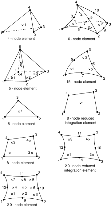 full integration is used; therefore, an AC3D4 element has 4 integration points, an AC3D5 element has 5 integration points, an AC3D6 element has 6 integration points, an AC3D10 element has 15 integration points, and an AC3D15 element has 18 integration points.