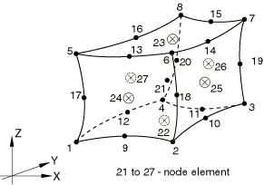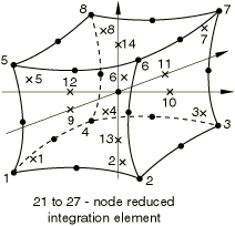 21 to 27-node brick, reduced integration, hybrid with linear pressure