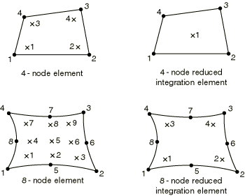 Active degrees of freedom1, 2 Additional solution variablesThe bilinear elements have 4N and the biquadratic elements 8N additional variables relating to . Element types CAXA4HN and CAXA4RHN have additional variables relating to the pressure stress. Element types CAXA8HN and CAXA8RHN have additional variables relating to the pressure stress. Pore pressure elements