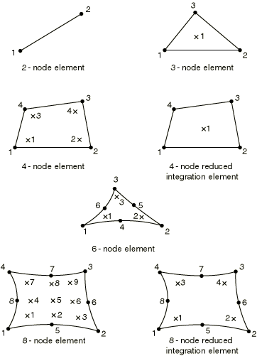 Numbering of integration points for outputFor heat transfer applications a different integration scheme is used for triangular elements, as described in Triangular, tetrahedral, and wedge elements. |