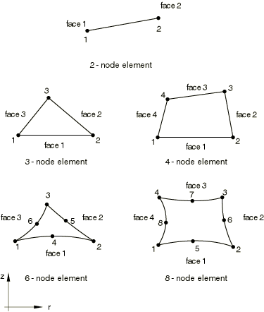 Active degrees of freedom1, 2, 8 at corner nodes 1, 2 at midside nodes Additional solution variablesThe constant pressure hybrid elements have one additional variable relating to the effective pressure stress, and the linear pressure hybrid elements have three additional variables relating to the effective pressure stress to permit fully incompressible material modeling. Element types CAX6MP and CAX6MPH have two additional displacement variables and one additional pore pressure variable. Coupled temperature–pore pressure elements