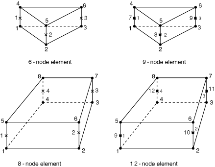 Active degrees of freedom1, 2, 3, 8 at nodes on the top and bottom faces 8 at nodes on the middle face Additional solution variablesNone. Nodal coordinates requiredElement property definitionYou can define the element's initial constitutive thickness. The default initial constitutive thickness of cohesive elements depends on the response of these elements. For continuum response, the default initial constitutive thickness is computed based on the nodal coordinates. For traction-separation response, the default initial constitutive thickness is assumed to be 1.0. For response based on a uniaxial stress state, there is no default; you must indicate your choice of the method for computing the initial constitutive thickness. See Specifying the constitutive thickness for details. Abaqus computes the thickness direction automatically based on the midsurface of the element. Input File Usage COHESIVE SECTION Abaqus/CAE Usage Property module: Create Section: select Other as the section Category and Cohesive as the section Type Element-based loadingDistributed loadsDistributed loads are specified as described in Distributed loads. *dload