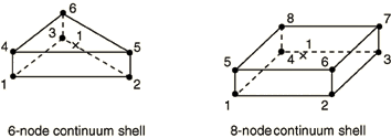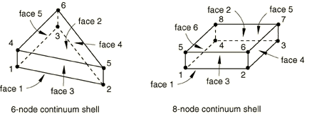![]() It is important to emphasize that stacks of continuum shells are connected through shared nodes, not through constraints or other elements. Suppose, for example, that in Figure 1 element pairs 1–2, 2–3, 4–5, and 5–6 are connected to each other through shared nodes, but elements 3 and 4 are connected through a constraint (such as a tied constraint). In that case Abaqus would interpret the bottom surface of element 3 and the top surface of element 4 as free boundaries; therefore, elements 1–3 would form one stack, and elements 4–6 would form a second independent stack. For another example, suppose that element 4 is not a continuum shell element. In this case elements 1–3 would form one stack, and elements 5–6 would form another stack. In a final example, suppose the stack directions of elements 1–5 are in the global z-direction and the stack direction of element 6 is in the global x-direction. In this case elements 1–5 would form a stack separate from element 6. In the three cases just discussed the computed values of CTSHR13 and CTSHR23 would probably not be what you wanted. It is more likely that you want elements 1–6 to be in the same stack. It may be necessary to make changes in your model to achieve this. You can review the partitioning of the continuum shell elements into stacks in the data file by making a model definition data request. The continuum shell elements in a stack must satisfy certain criteria; otherwise, Abaqus marks the stack as invalid with respect to computing CTSHR13 or CTSHR23. If a stack is marked as invalid, CTSHR13 or CTSHR23, if requested, are not computed and are set to zero for all continuum shell elements in that stack. If a continuum shell element does not have an elastic material model, if you specify the transverse shear for any element in the stack, or if the element is specified as rigid, that stack is marked as invalid. A stack is also marked as invalid if the normal of any element in a stack is not within 10° of the average normal for the stack. In addition, if a continuum shell element is removed during the analysis, the stack to which the element belongs is marked as invalid until the element is reactivated. There are several other certain restrictions on CTSHR13 and CTSHR23. CTSHR13 and CTSHR23 are not available in any continuum shell element with a multi-layer composite material definition. However, having a multi-layer composite element in the stack does not invalidate the stack. For the purposes of computing CTSHR13 and CTSHR23, a maximum of 500 continuum shell elements can be put in any individual stack. If more than 500 continuum shell elements are stacked on top of each other, Abaqus issues a warning message during input file preprocessing, and CTSHR13 and CTSHR23 are not computed and are set to zero for all continuum shell elements in the model. CTSHR13 and CTSHR23 are not available if element operations are run in parallel (see Parallel execution in Abaqus/Standard). CTSHR13 or CTSHR23 are currently available only for static and direct-integration dynamic analyses. An example using CTSHR13 and CTSHR23 to estimate the transverse shear stress distribution in stacked continuum shells can be found in Composite shells in cylindrical bending. Node ordering on elements