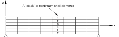 Estimates of the transverse shear stresses that take into account the continuity of interlaminar transverse shear stress for stacked continuum shells are available at section integration points as output variables CTSHR13 or CTSHR23 for both Simpson's rule and Gauss quadrature. CTSHR13 or CTSHR23 are available only in Abaqus/Standard. CTSHR13 and CTSHR23 are not calculated from the constitutive behavior at points through the shell section. They are estimated by assuming a quadratic variation of shear stress across the element section and by enforcing the continuity of interface transverse shear between adjoining continuum elements in a stack. It is also assumed that the transverse shear is zero at the free boundaries of a stack. The intended use case for CTSHR13 and CTSHR23 is to estimate the through-the-thickness transverse shear stress for flat or nearly flat composite plates that are modeled with stacked continuum shell elements where each continuum element in the stack models a single material layer. Central to CTSHR13 and CTSHR23 is the concept of a stack of continuum shell elements. During input file preprocessing Abaqus partitions all the continuum shells in a model into stacks. A stack is defined as a contiguous set of continuum shells whose first and last elements lie on a free boundary and who are connected through shared nodes on the top and bottom element surfaces (as determined by the elements' stack directions). In this context a free boundary is a top or bottom surface of a continuum shell element that is not connected through its nodes to another continuum shell element. For example, assuming that the stack direction of all the elements in Figure 1 is in the z-direction, elements 1–6 would form a stack. Figure 1. Composite plate meshed with six stacked continuum shells through the thickness.